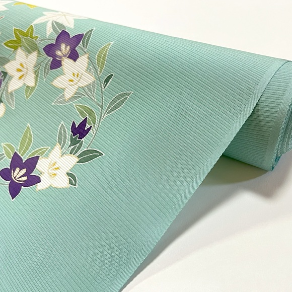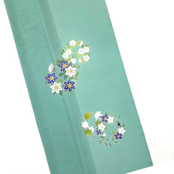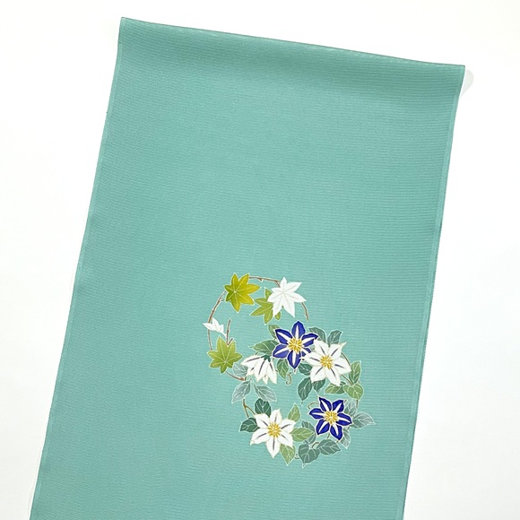 夏にちなんだ草花、鉄線・楓・桔梗・萩・朝顔・撫子・菊・菖蒲を花の丸に図案化し、工芸キモノ野口ならではの配色で全て手描きで表現しております。