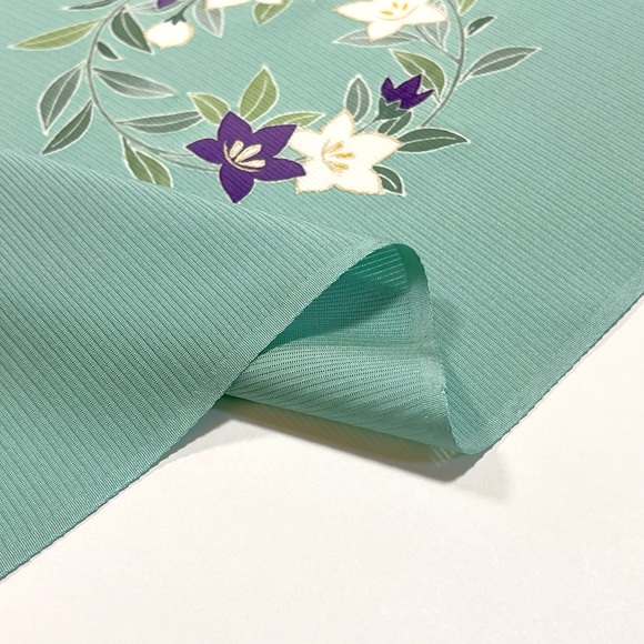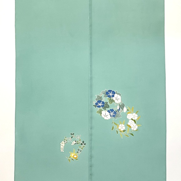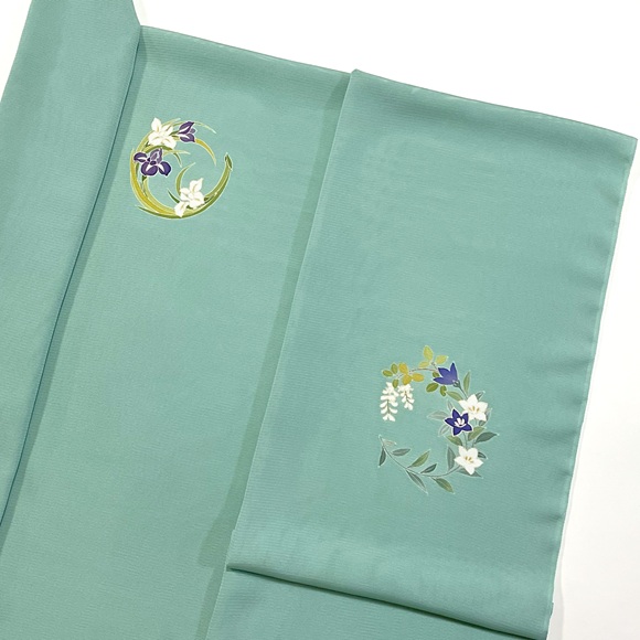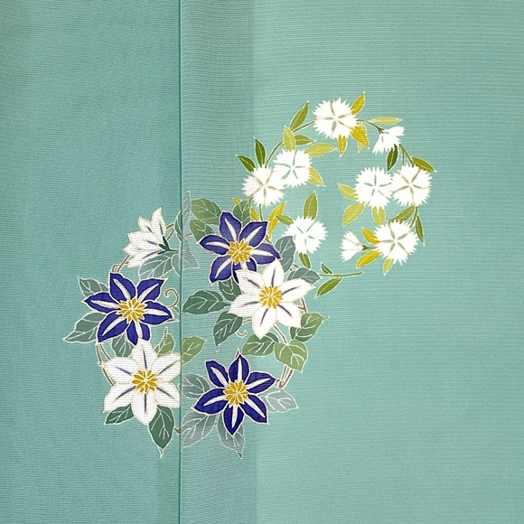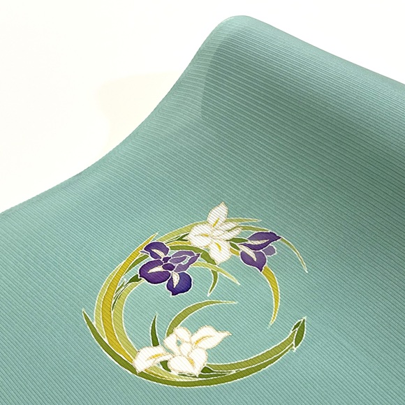 上質な駒絽地を薄浅葱色に染め、花の丸を配した付下げでございます。