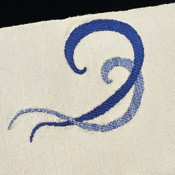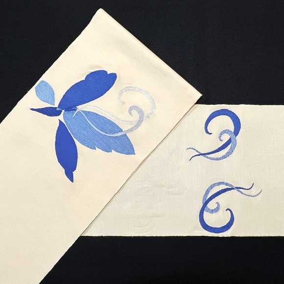 どんな着物にでも合いそうなクリーム地に、瑠璃色と薄群青、銀の濃淡で表された大胆な蝶に心奪われ、弊社に嫁いでいただくことになりました。