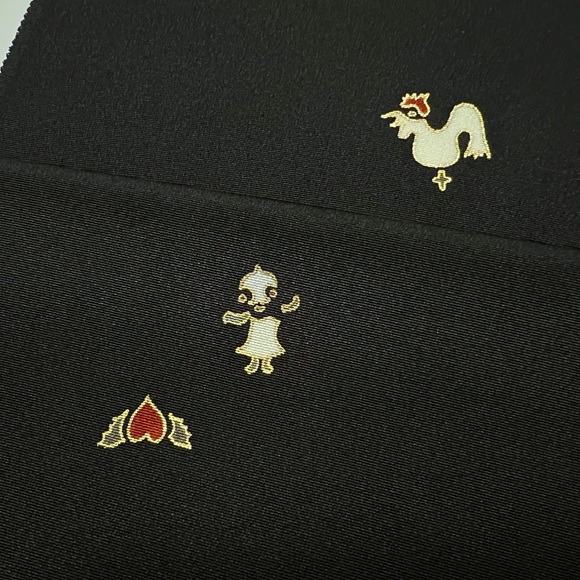糸目型手挿し友禅で表された模様は、パリ郊外のバークル村にある藤田嗣治氏のアトリエ、そして壁や柱に描かれた絵をモチーフに図案化されています。