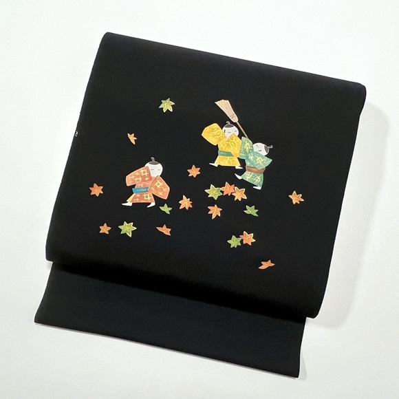 散った紅葉を童たちがお掃除する姿を、手描きで表現した楽しい図案の染帯でございます。