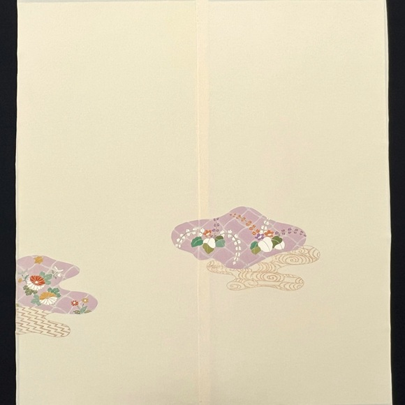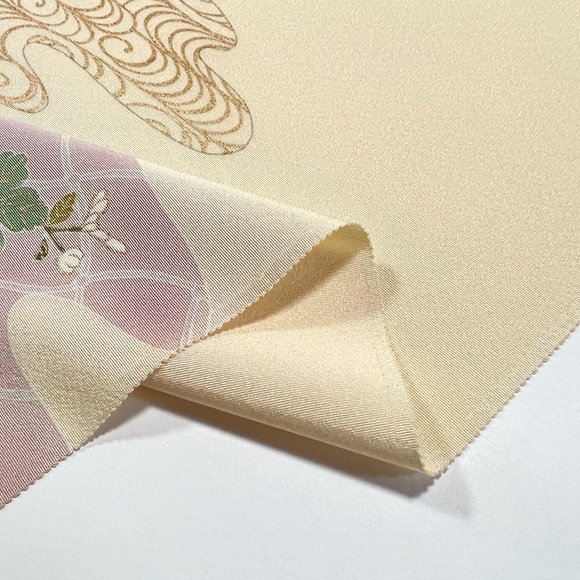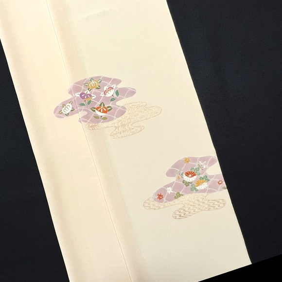 雲取りの中に金で縁取った手描きの草花文様や、観世流水などを表しており、敢えてあっさりとした柄付けにして着用出来るシーンの幅を広くしております。
