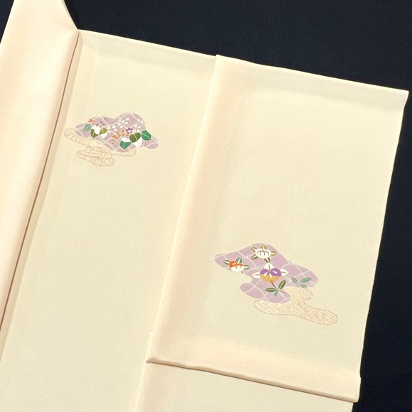 草花文様の途中で行われる唐突な色替わりは桃山小袖の特徴でして、あっさりした柄付けの中にも華やかさを取り入れております。