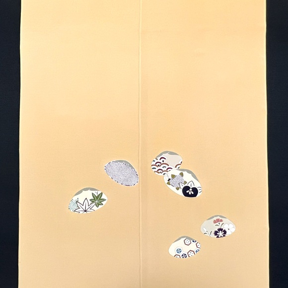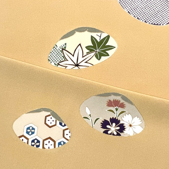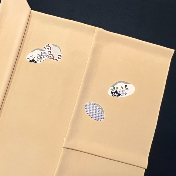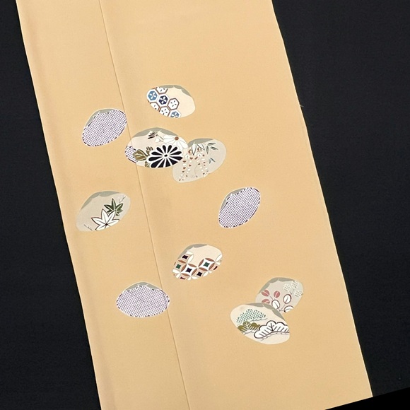 上質な長浜ちりめんの白生地を黄土色に染め、貝合せの文様を配した付下げでございます。