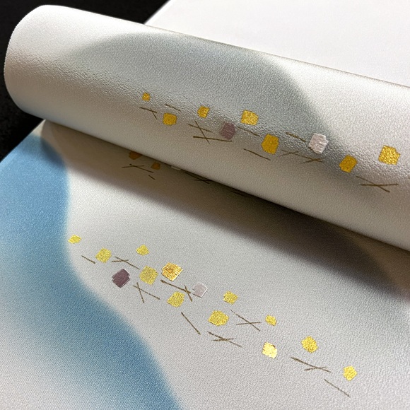 切箔も上品に散し、その中に手刺繍も入れておりましてお召いただくと刺繍部分が浮かび上がり、さりげない高級感を醸し出してくれます。