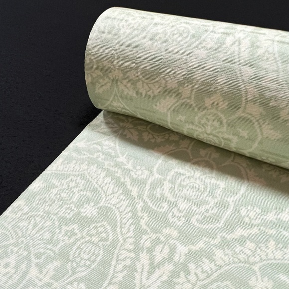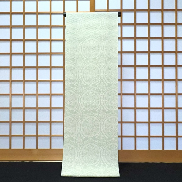 上質な影織地を青磁鼠色に染め、ローマ法皇文を表した小紋です。