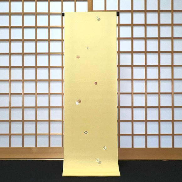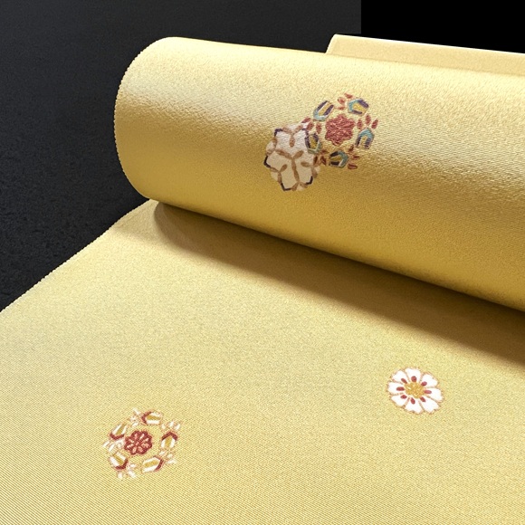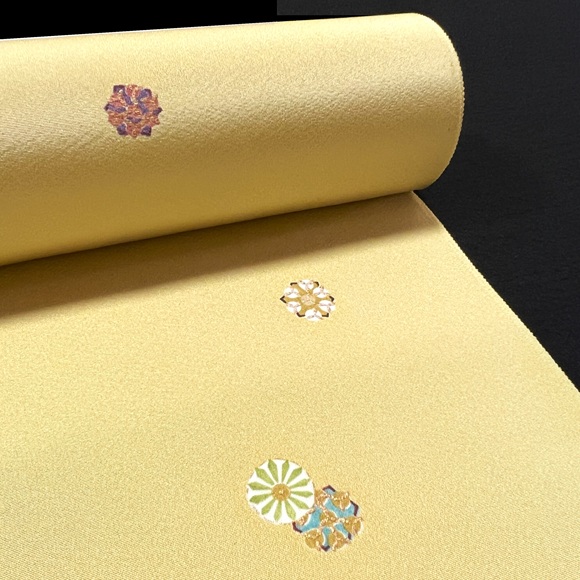 上質な白生地「凛」を落ち着いた黄色に染め、彦根更紗を散らした小紋です。
