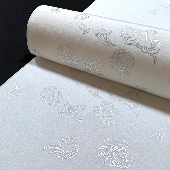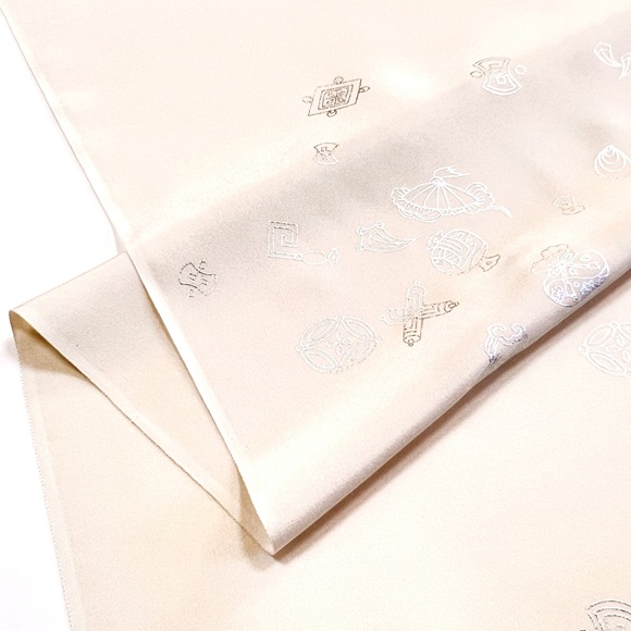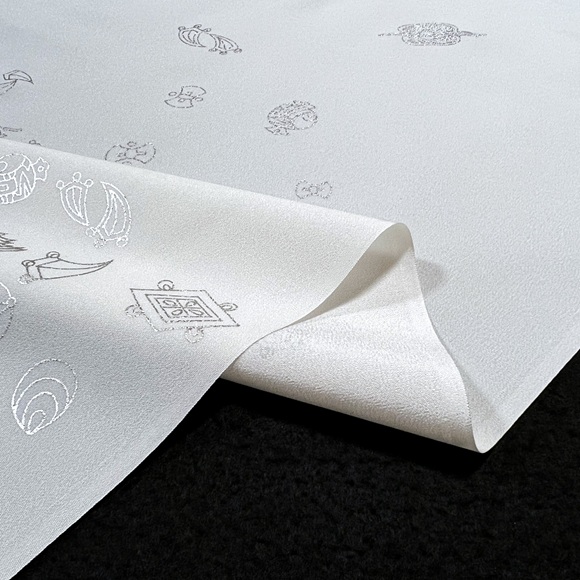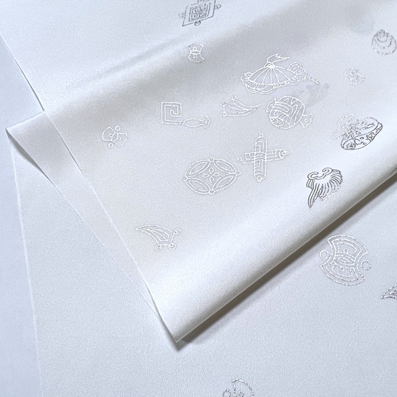 上質な精華の白生地に銀で宝尽しを散らした工芸キモノ野口の長襦袢です。