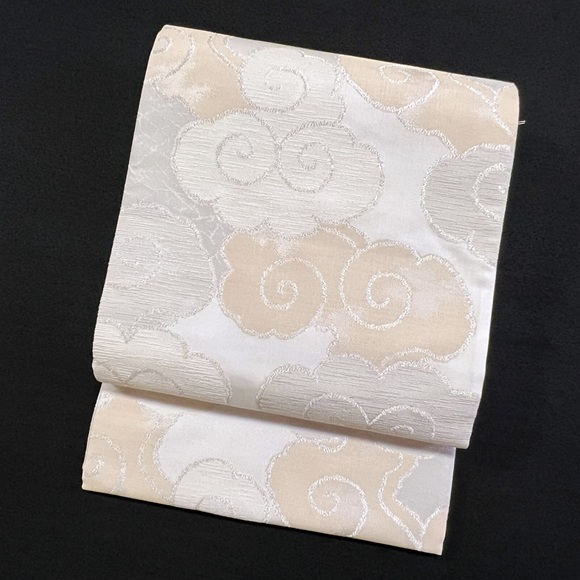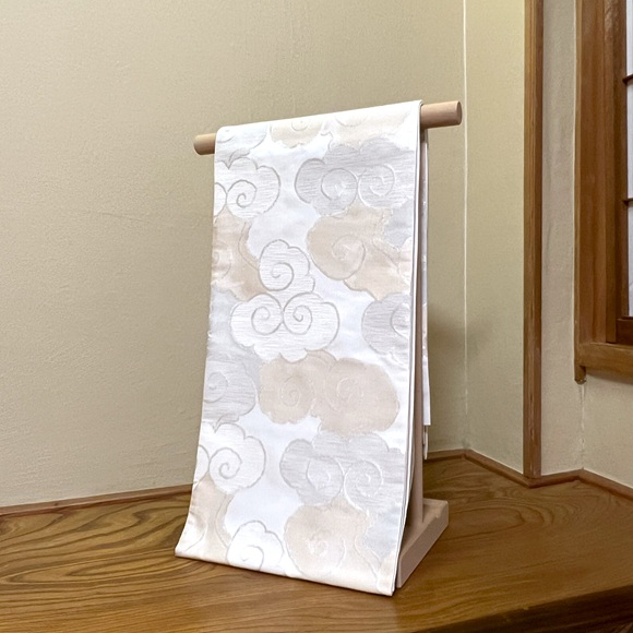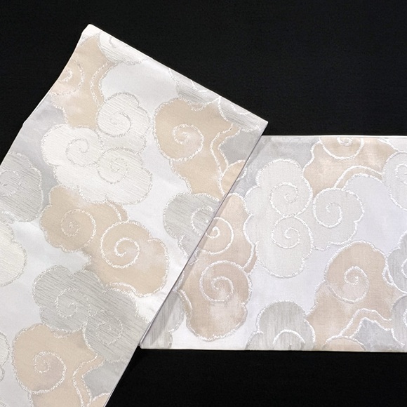 本日ご紹介致します商品は、洛風林の洸絲織袋帯「雲流(白/薄香・白鼠)」でございます。