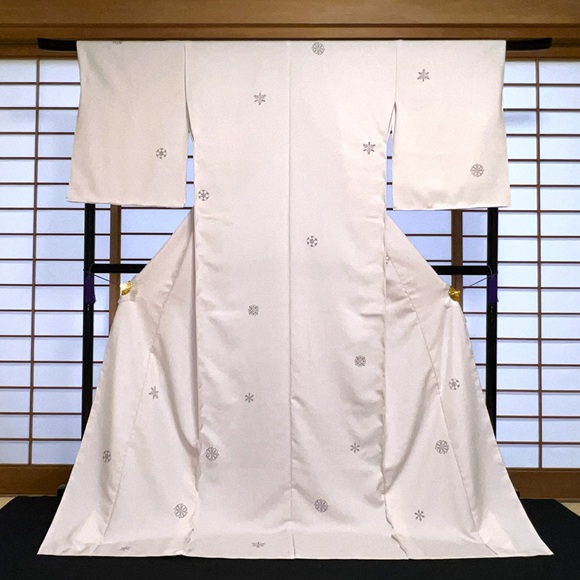 上質な紬の白生地「紋紬」をベージュに近い薄鴇色に染め、雪華文様を散らした小紋でございます。