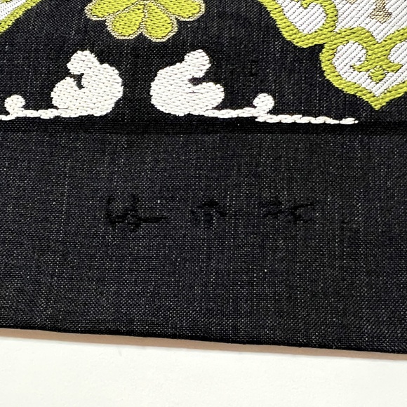 黒地に鶸萌黄・鴇浅葱・灰白の配色は小袖などに使われた日本的な配色で、お洒落着物に合わせる帯としてお使いいただけます。