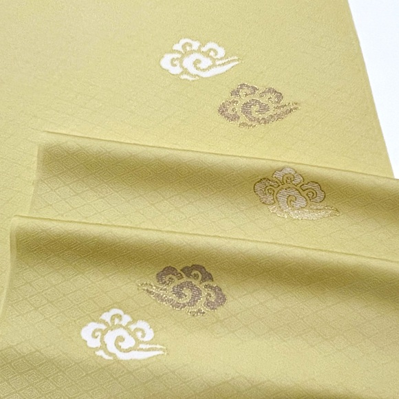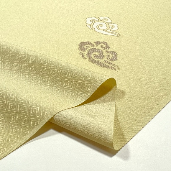 伊と幸の松岡姫で織られた上質な白生地「紋御戸代」を綺麗な黄色に染め、瑞雲文様を散らした小紋です。