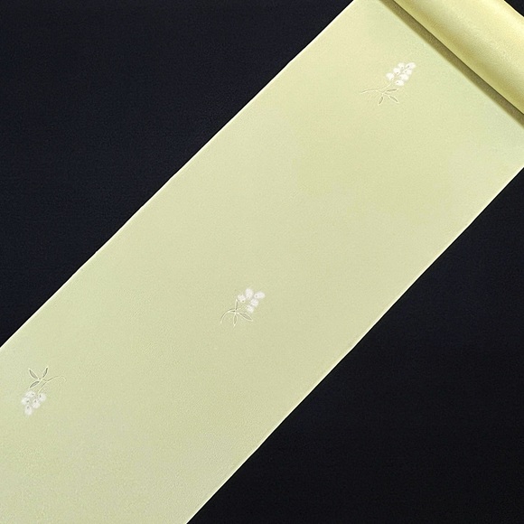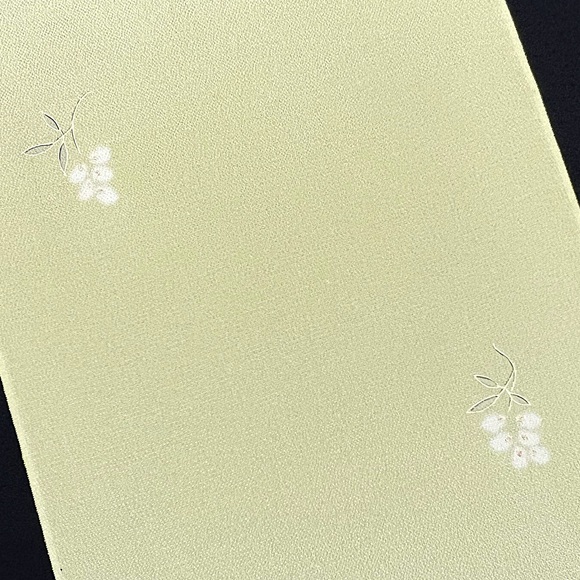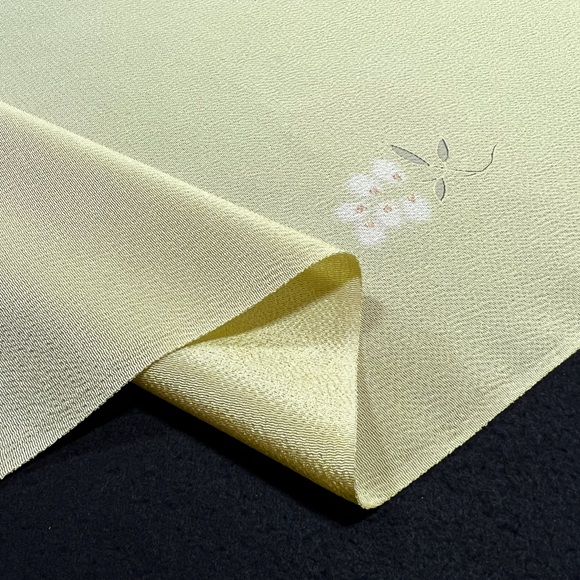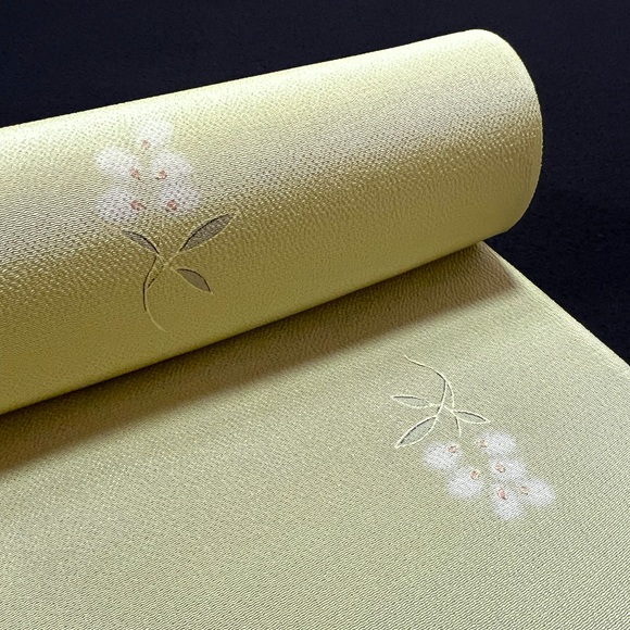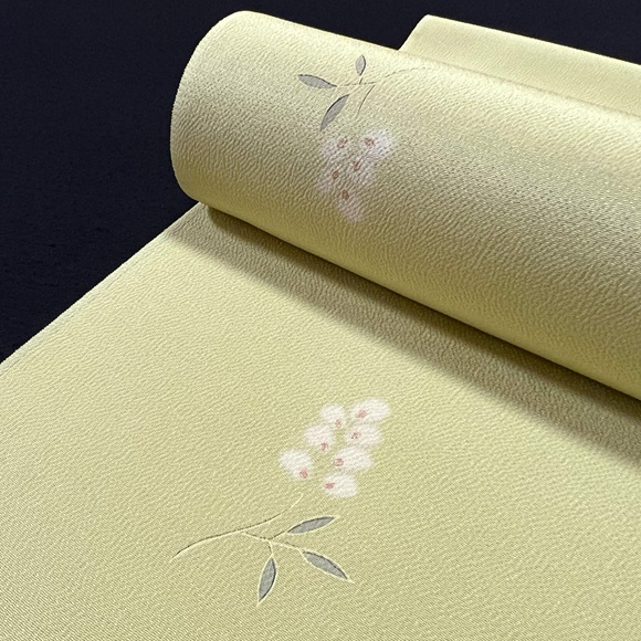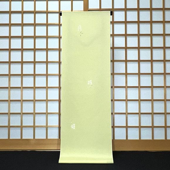 上質な鬼しぼちりめんを若葉色に染め、藤の柄を散らした小紋です。