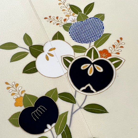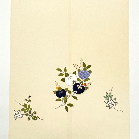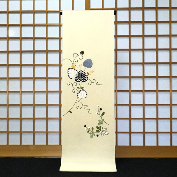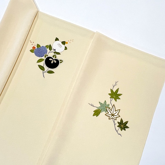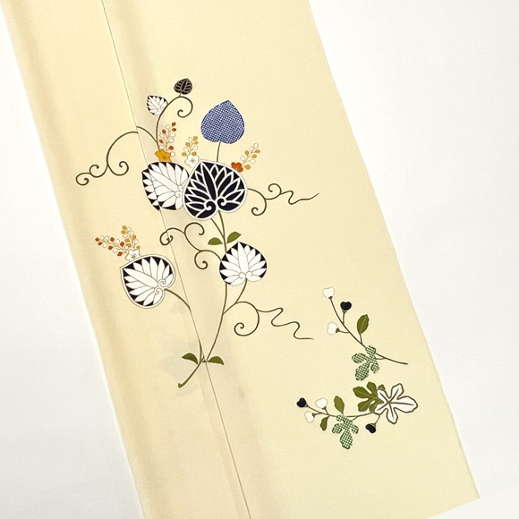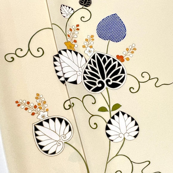 手描きと染疋田で表された草花文様、「葵」「橘」「楓」そして「梶の葉」が表されております。