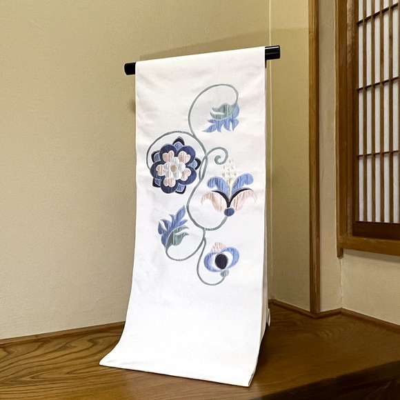 白よごし地に青磁、青藤、深縹、灰桜色で表現された「クレムリンの花」