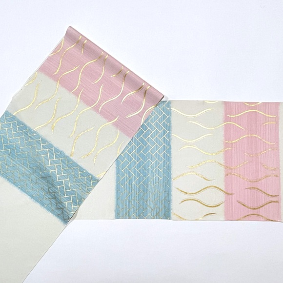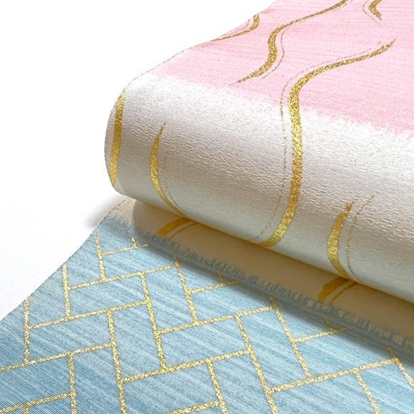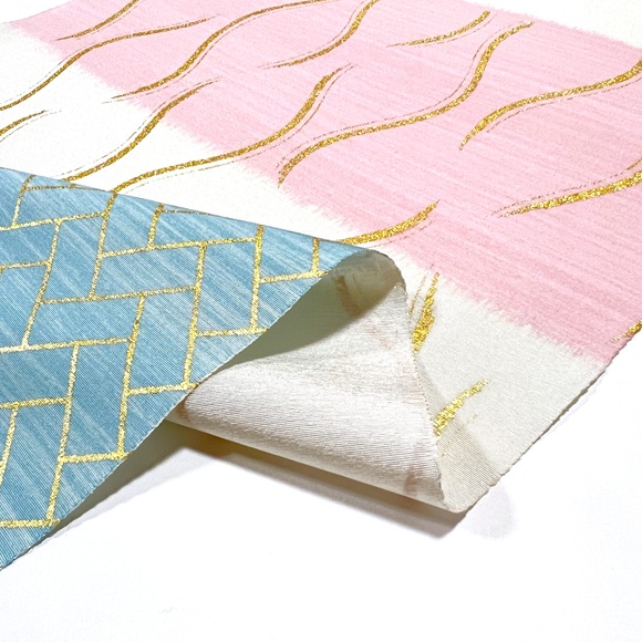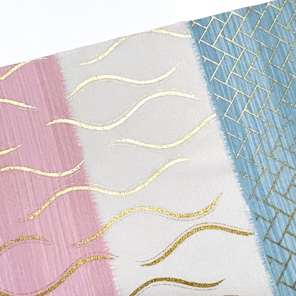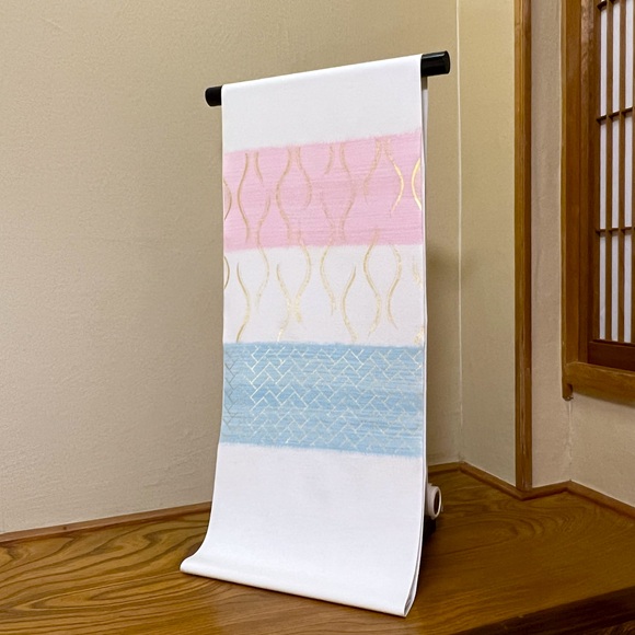 愛らしい桃色と爽やかな青色の横段暈しの上に立涌文様と桧垣文様を金彩で表しております。