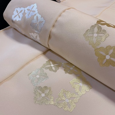 上質な白生地「綾菊」を淡い灰桜色に染め、金箔・銀箔の花菱模様を配した付下げでございます。
