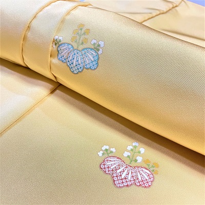 上質な白生地「初音」を美しい黄色地に染め、桐・笹・桜を散した小紋です。
