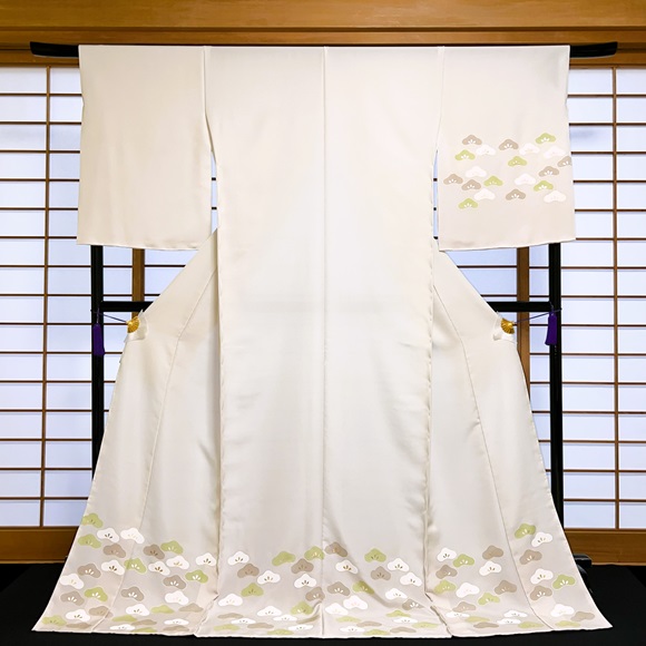 上質な伊と幸の白生地を淡鼠色に染め、松と裾暈しを配した付下げでございます