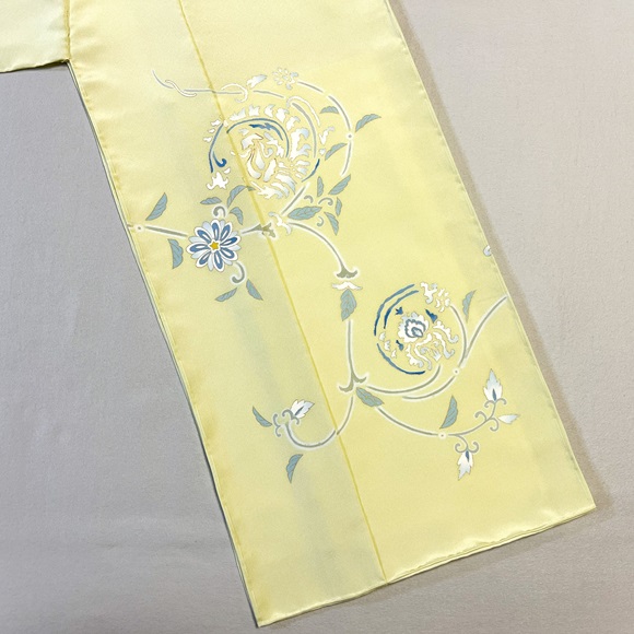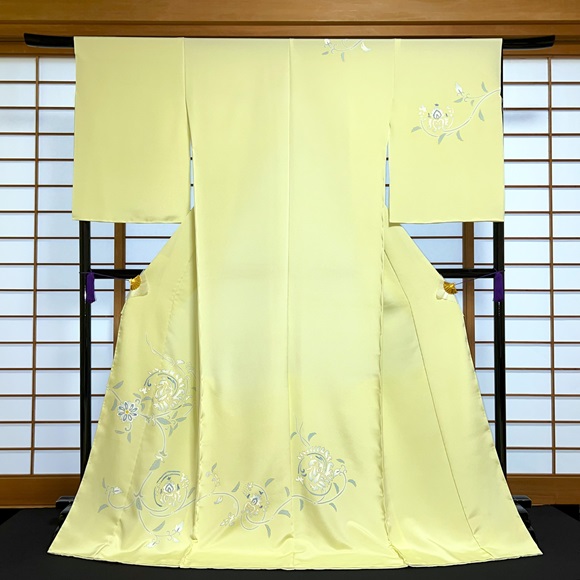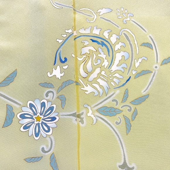 上質な白生地「凛」を黄色味が強い若草色に染め、正倉院模様の唐花を配した付下げでございます