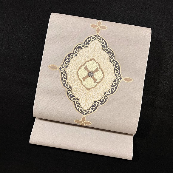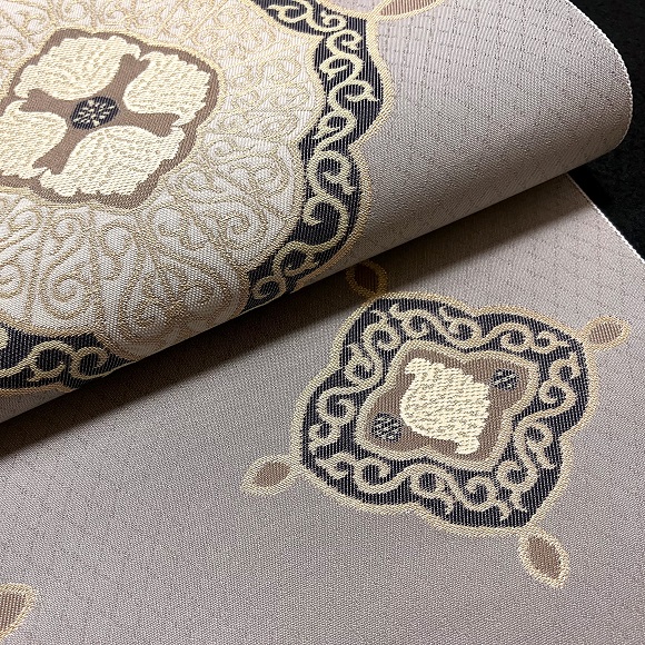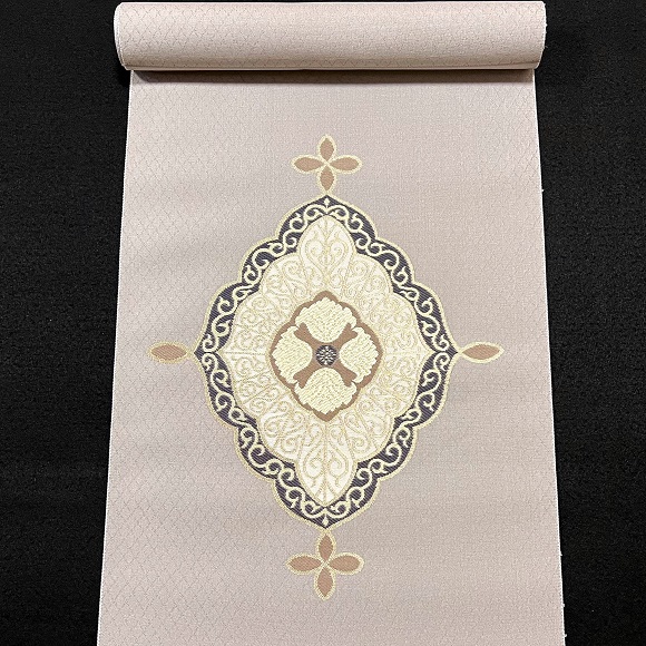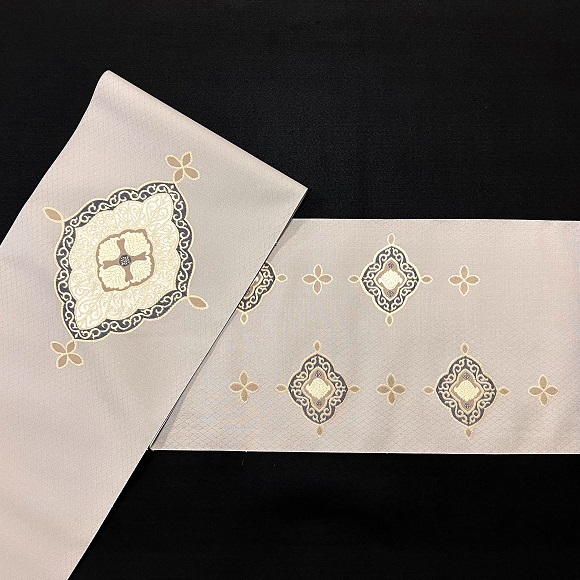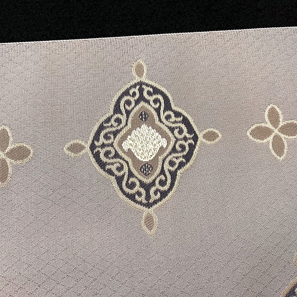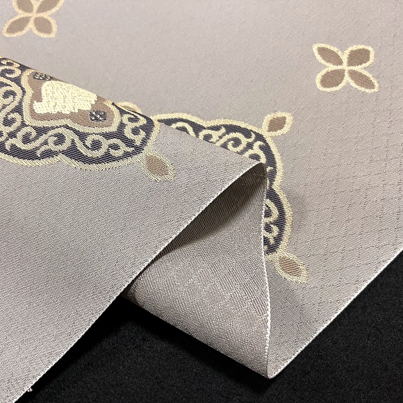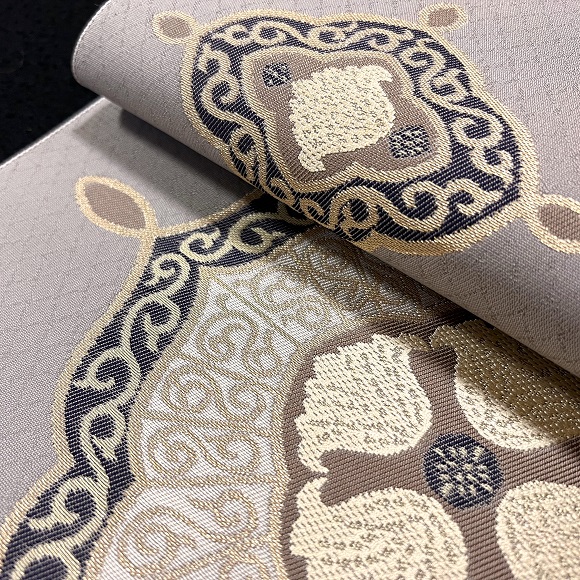 シックな薄グレー地に北欧の紋章の様な高貴で美しい華文のこちらの帯は、洛風林ならではの美しい意匠で表現されております。
