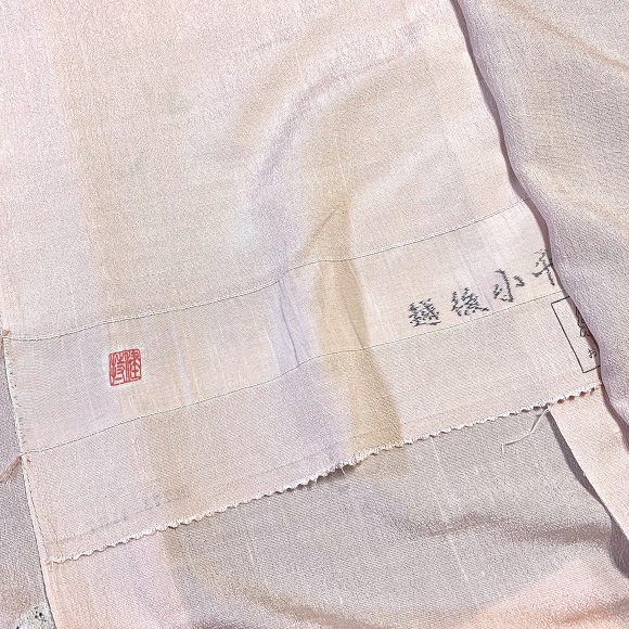 そして良くお問合せいただく事なのですが、こちらの商品は未仕立てでございます。簡単な仮仕立てで撮影をした後に、直ぐ解き湯のし・筋や汚れの地直しをして反物状態に戻しております。現在は販売し易いように仮絵羽にしております。