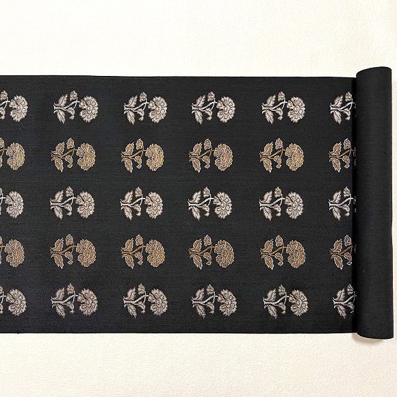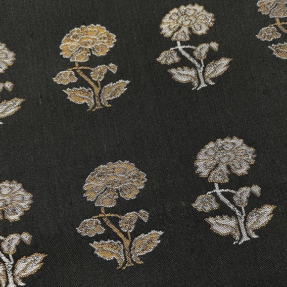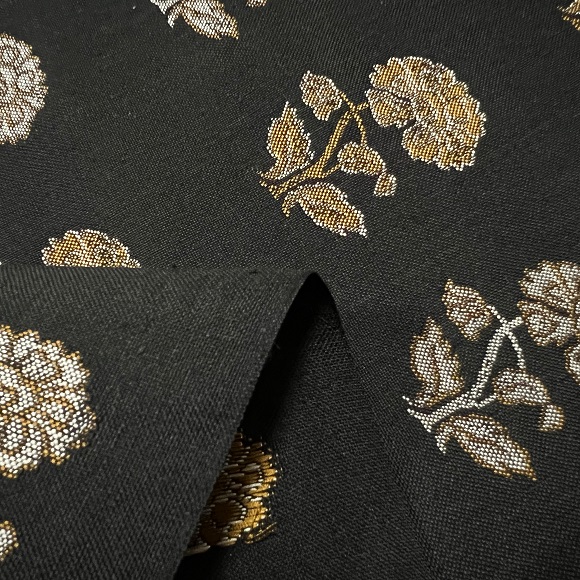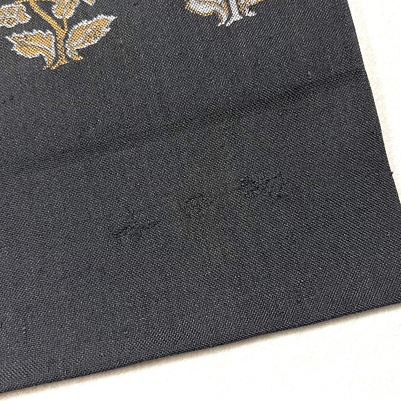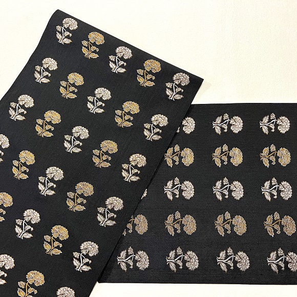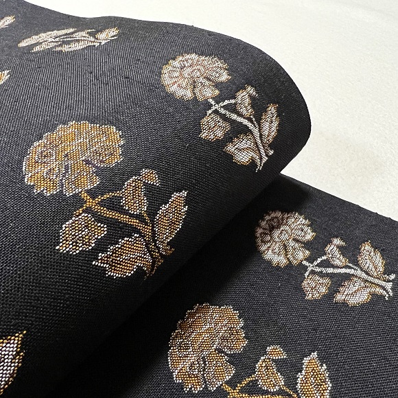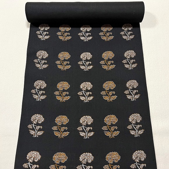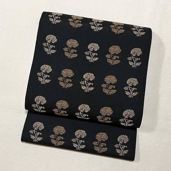 黒の地色に茶とグレーの蔓花が並んだ配色は品よく洗練された美しさがあり、落ち着いた大人の着こなしに最適です。