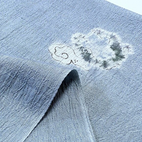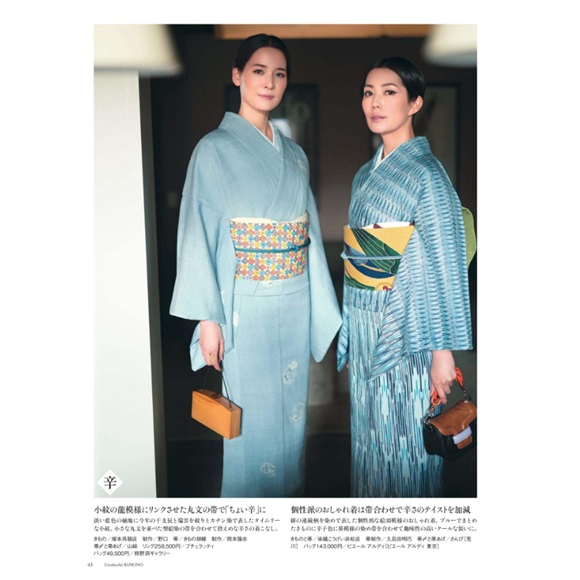 地色は「水色」、落ち着いたブルーグレーと申し上げたら宜しいでしょうか、美しいキモノ本誌でも辛口の装いのイメージでご紹介いただいてます様に、クールな着こなしにぴったりの素敵なお色です。