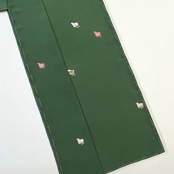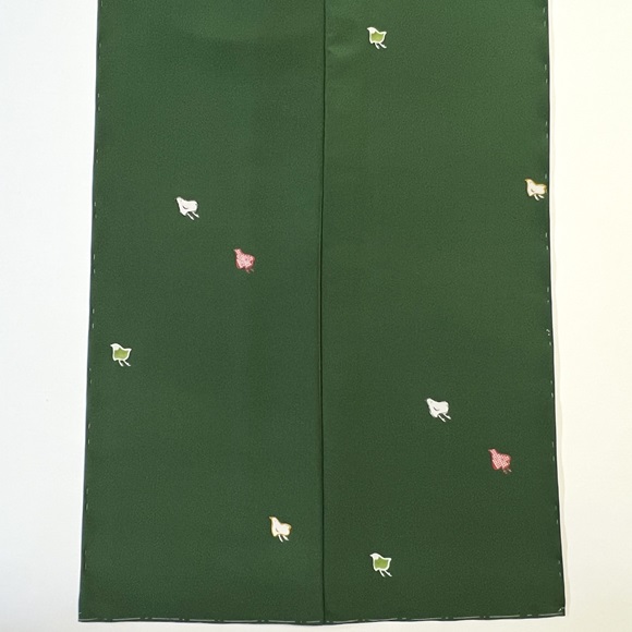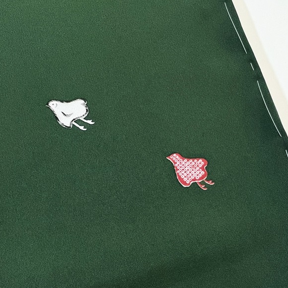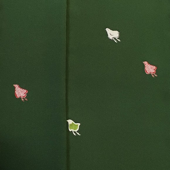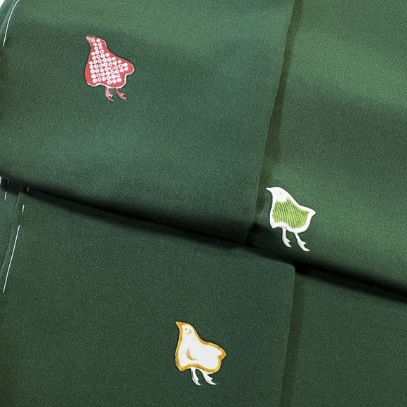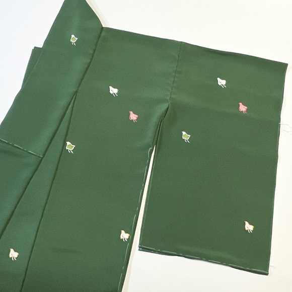 少し肉厚で光沢の出る上質な駒無地風の生地「綾衣」を深緑色に染め、千鳥文様を付下げ調に配した小紋付下げです。