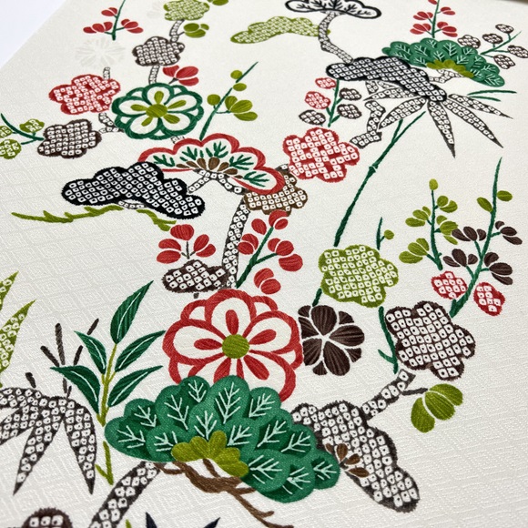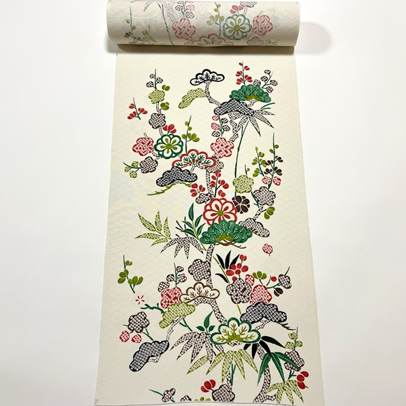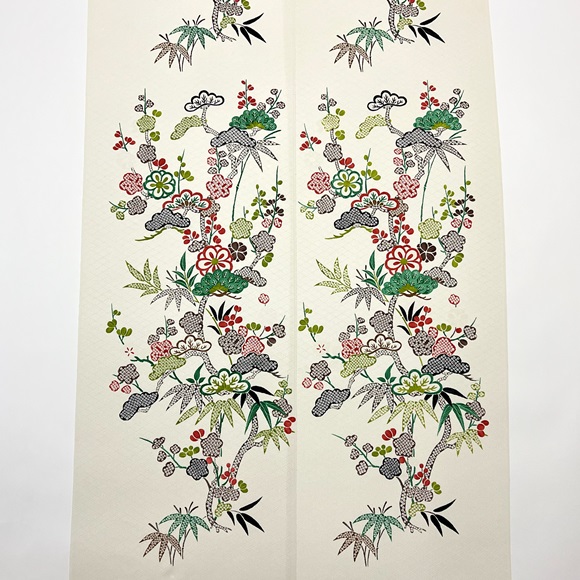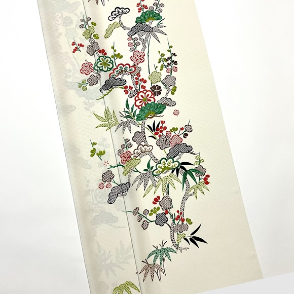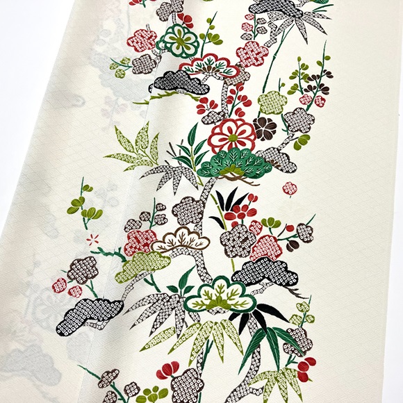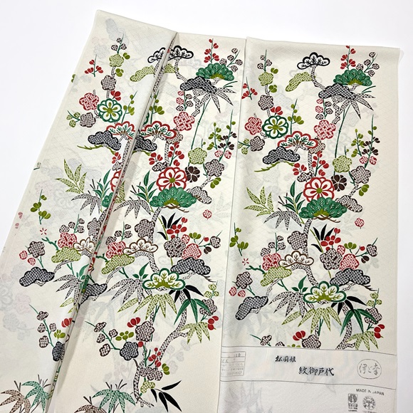 こちらの商品は、お仕立てしても「松竹梅」の柄が反対に一方付けで位置を決めて染めております(上前と衽の柄合わせは可能です)
