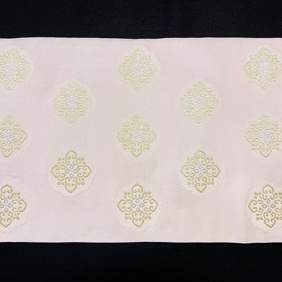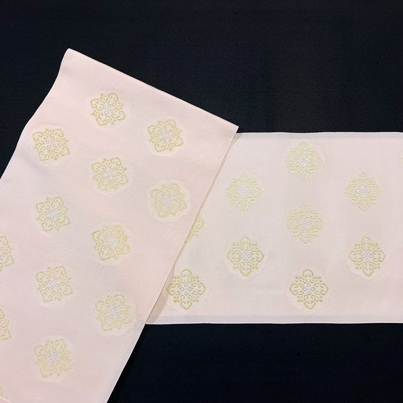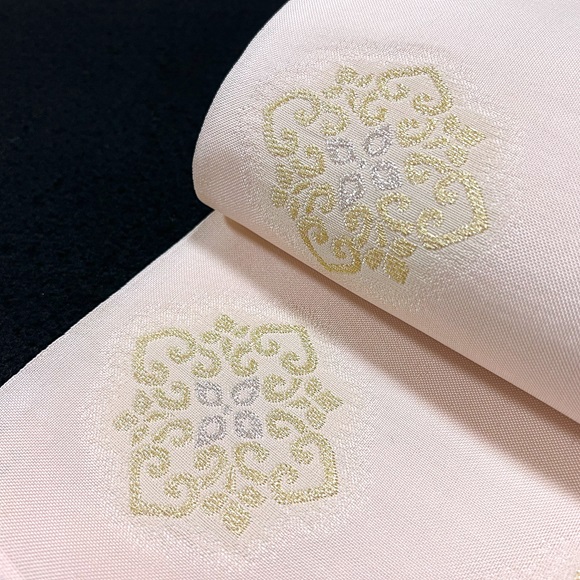 ほんのりした薄桜色の地色に控えめな金銀で図案化された唐花文様が見事に表現されております。