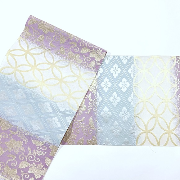 「名物裂集」と名付けられたこの帯は、花菱・七宝・桐唐草と代表的な名物裂の文様を横段に集めた上品な名古屋帯です。