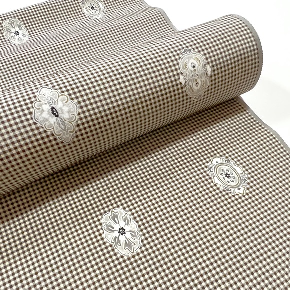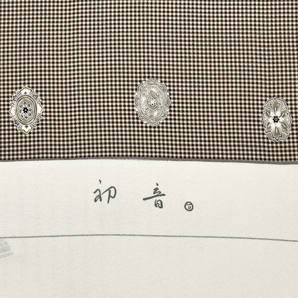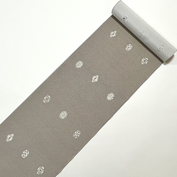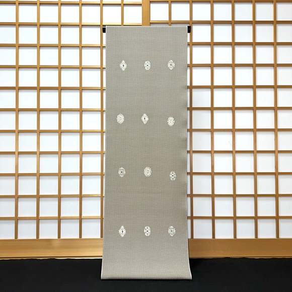 上質な白生地「初音」に鼠色と白茶色の小霰(小格子)を染め、華紋を配した小紋です。