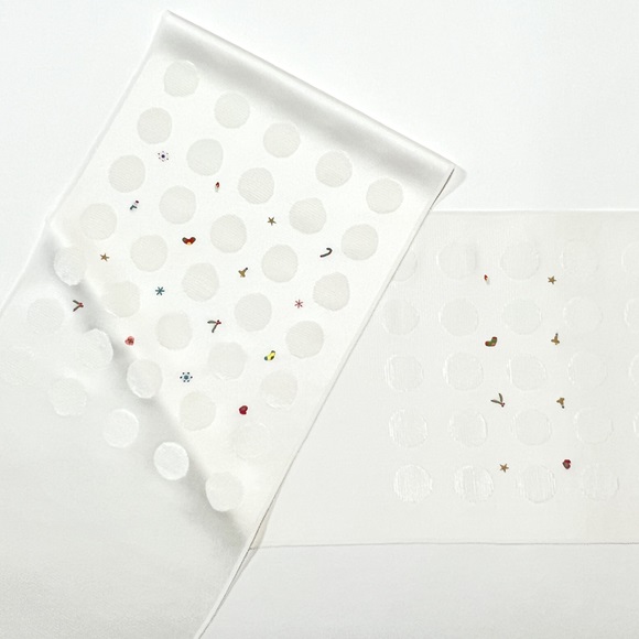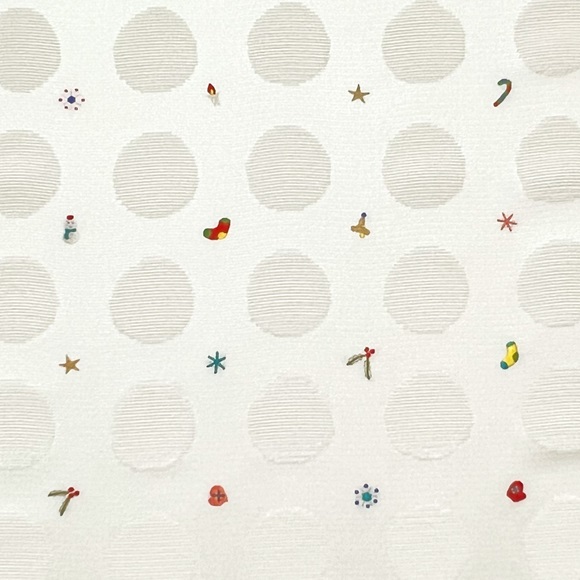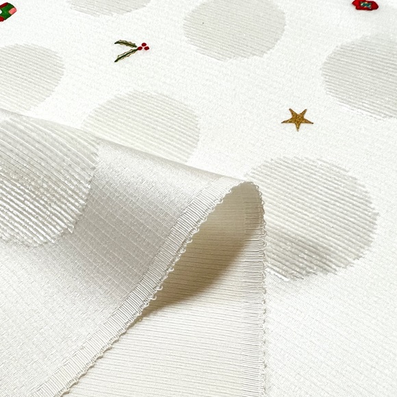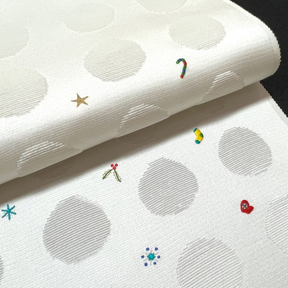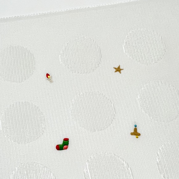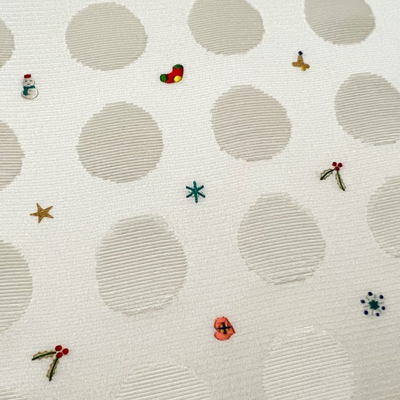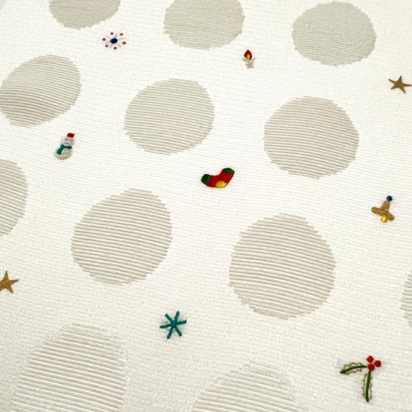 切りビロードのドットの間に、手刺繍と箔で表した小さくて可愛い「柊」や「靴下」、「雪の結晶」などのクリスマス文様を散りばめております。