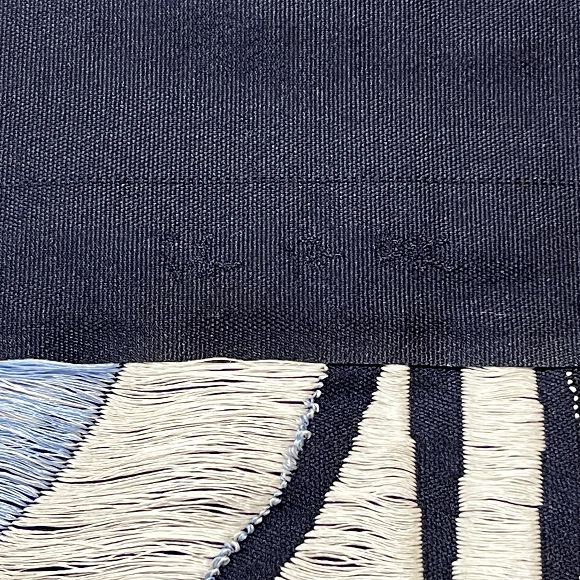 今回の紺地にシルバーとブルーの配色は、洛風林らしい個性的でダイナミックなイコンダール立涌の名古屋帯に織り上げられていると思います。