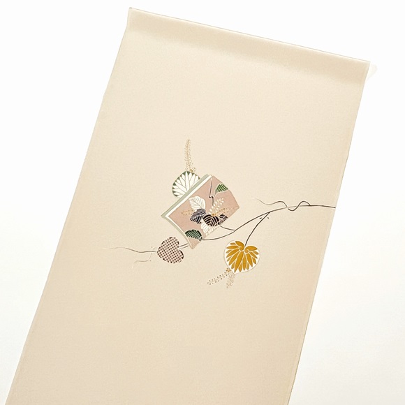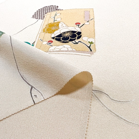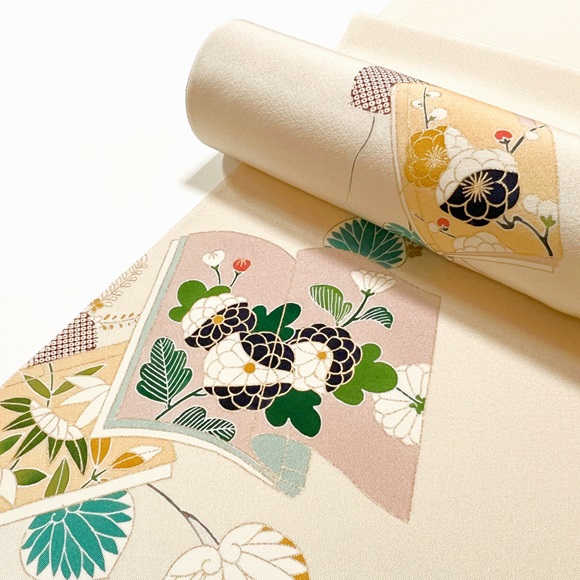 金で縁取られた草花や本の文様は、工芸キモノ野口ならではの配色で表現され、古典文様なのに新しさを感じさせてくれます。