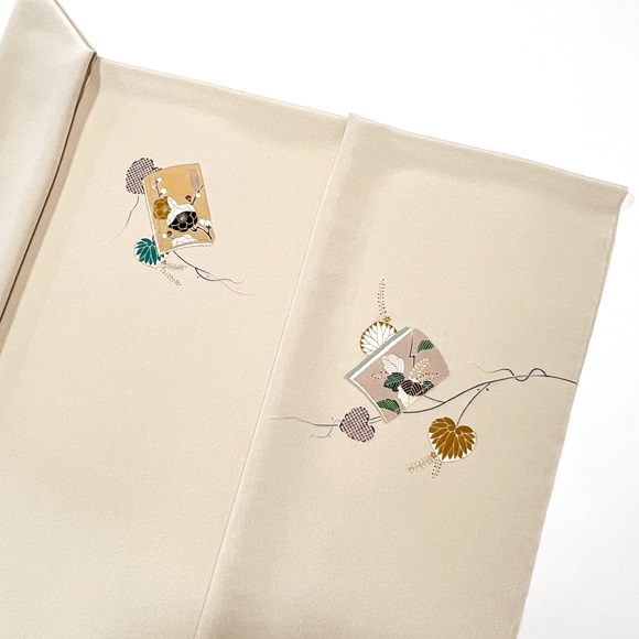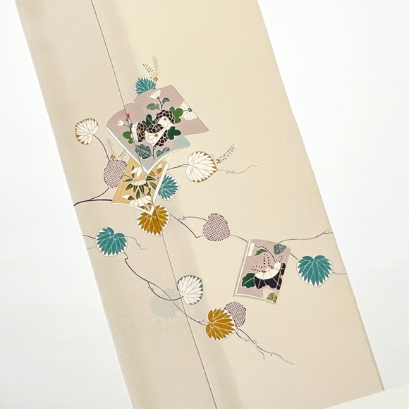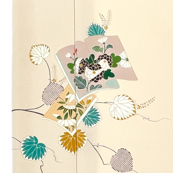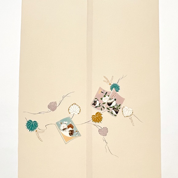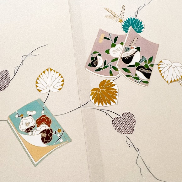 手描きと染疋田で表された葵文様、そして冊子文の中には「菊」「桐」「橘」「笹」「梅」が桃山調に描かれております。