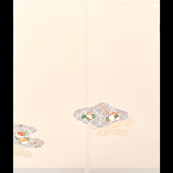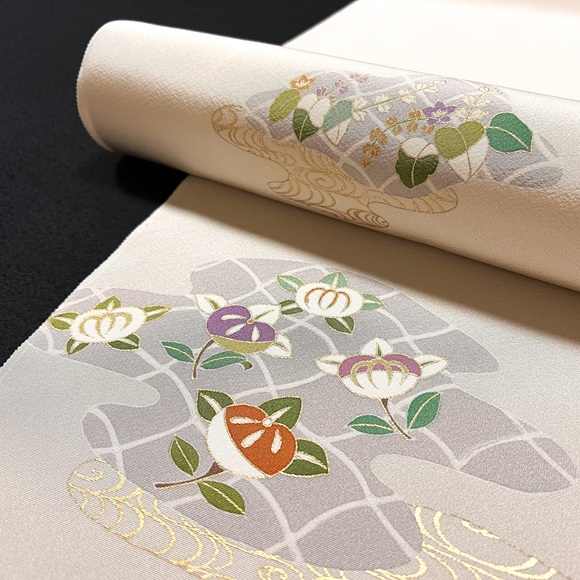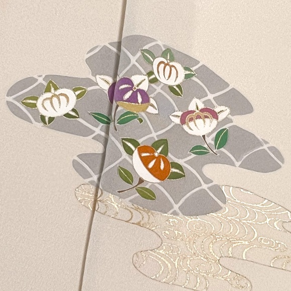 雲取りの中に金で縁取った手描きの草花文様や、観世流水などを表しており、敢えてあっさりとした柄付けにして着用出来るシーンの幅を広くしております。