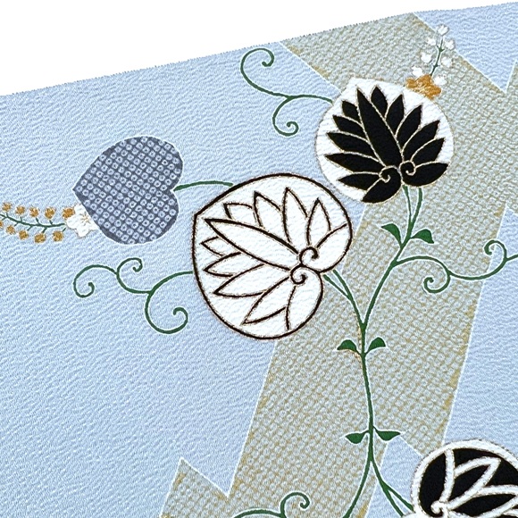 染疋田で表された松皮菱を背に、手描きと染疋田で表現された葵文様を配しております。