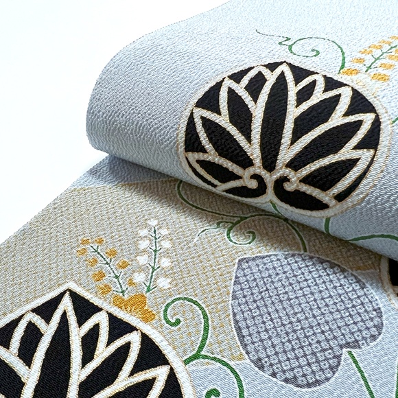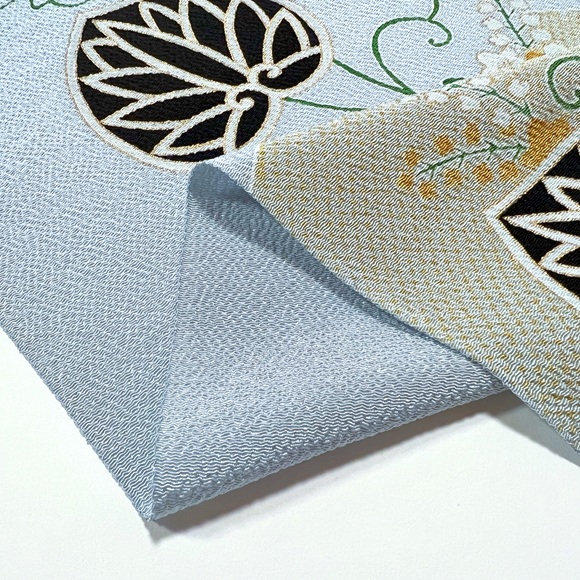 しぼの高い上質な浜ちりめん地を水色に染め、葵と松皮菱を表した名古屋帯です。