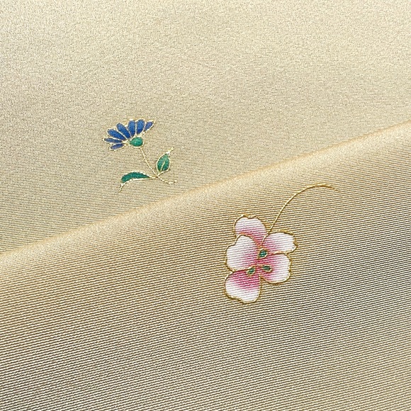上質な白生地「凛」を白橡色に染め、フランドルの花を表した小紋です。