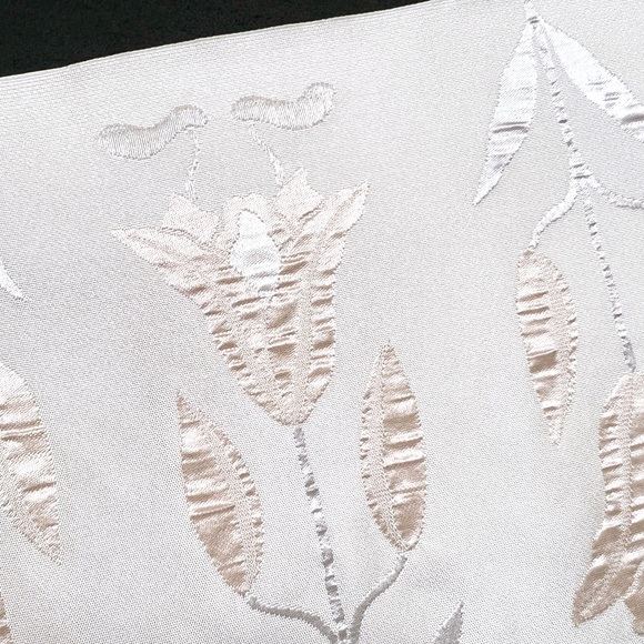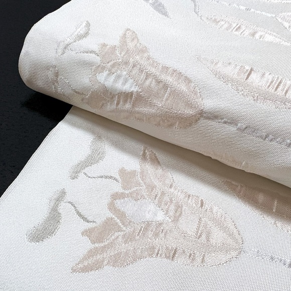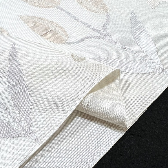 今回の百合文は、白よごし地に灰桜色、白鼠色、銀色で織り上げられたワントーン的な帯ですので、様々な色柄のお着物に合わせやすいのが嬉しいですね。