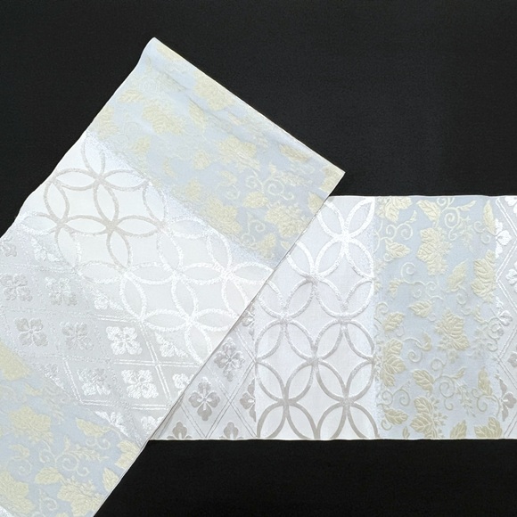 「名物裂集」と名付けられたこの帯は、花菱・七宝・桐唐草と代表的な名物裂の文様を横段に集めた上品な名古屋帯です。
