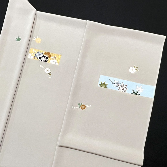 以前は、手描きと染疋田で四季の草花と有職文様を表した付下げだったのですが、今回は金箔を追加で入れて格調高さも表現していただきました。