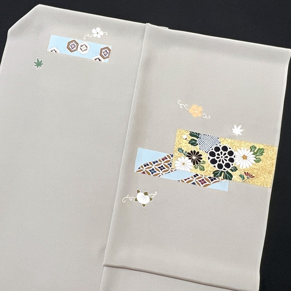 上質な白長浜ちりめんの白生地を茶鼠色に染め、色紙取りの中に有職文様や草花を配した付下げでございます。