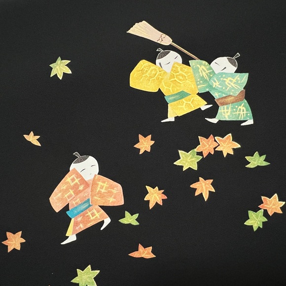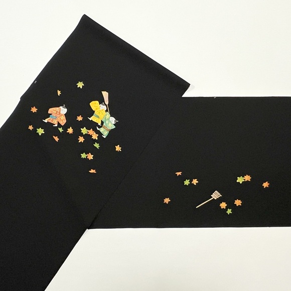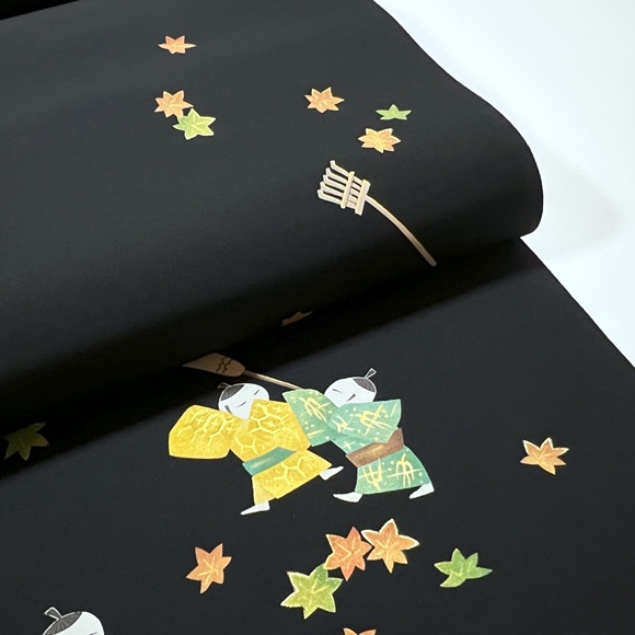 散った紅葉を童たちがお掃除する姿を、手描きで表現した楽しい図案の染帯でございます。