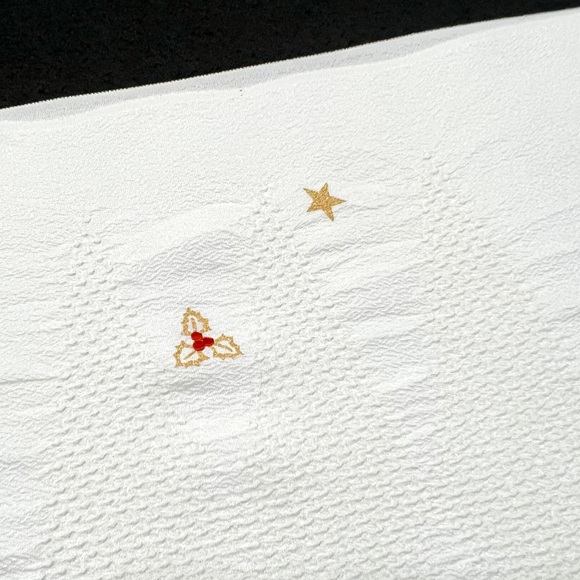 上質な白生地をダイヤ柄に絞り、刺繍でクリスマスリースと柊を表した名古屋帯です。