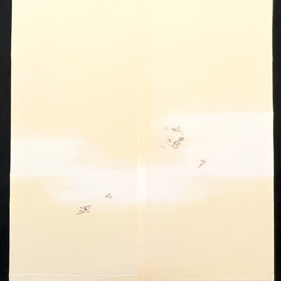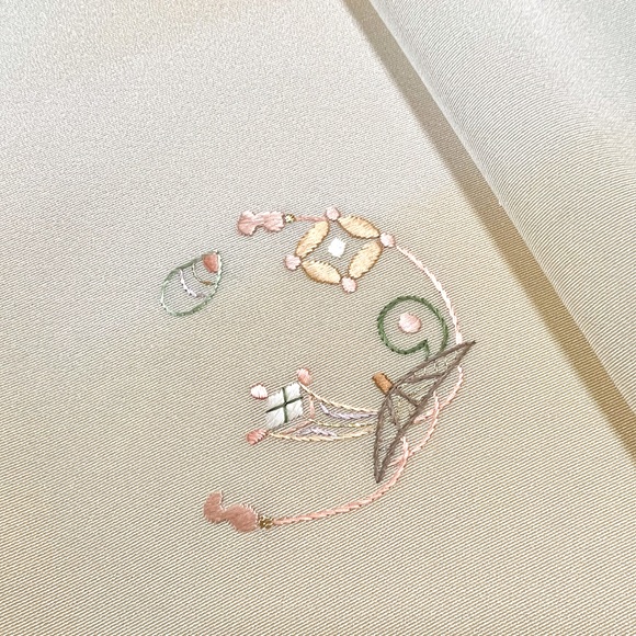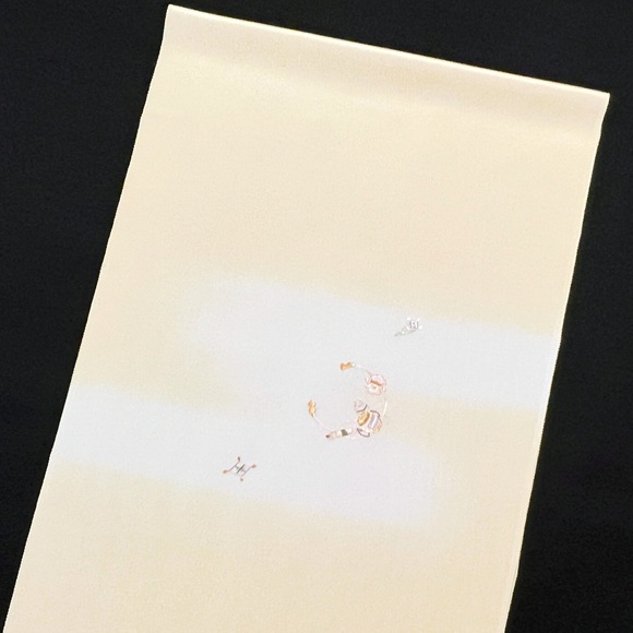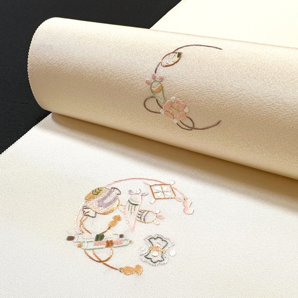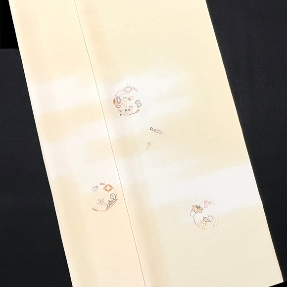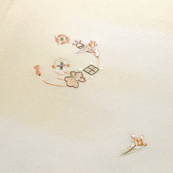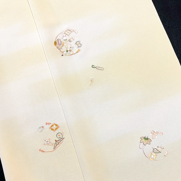 淡い玉子色の地色に上品な霞暈しをほどこし、手刺繍で表した宝の丸も全て上品で控えめな配色で表現しております。