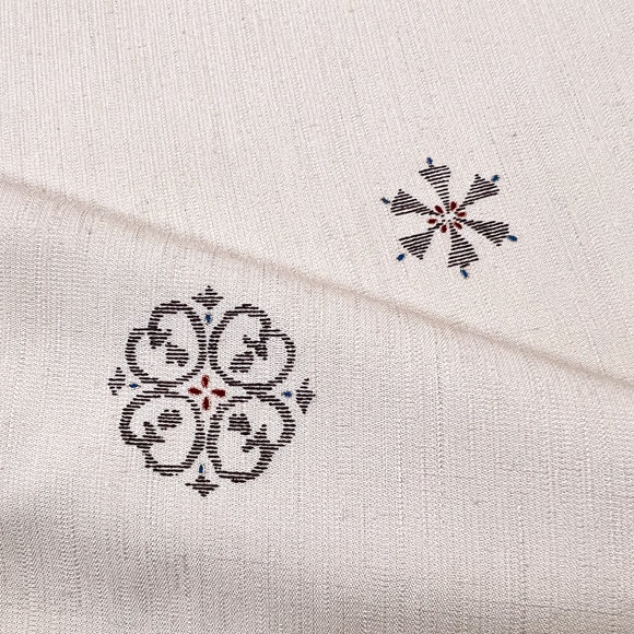 こちらの小紋は、まるで刺繍のスガ縫いの様に見える雪華文様を京型友禅で表した逸品。