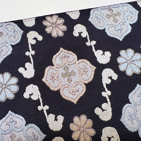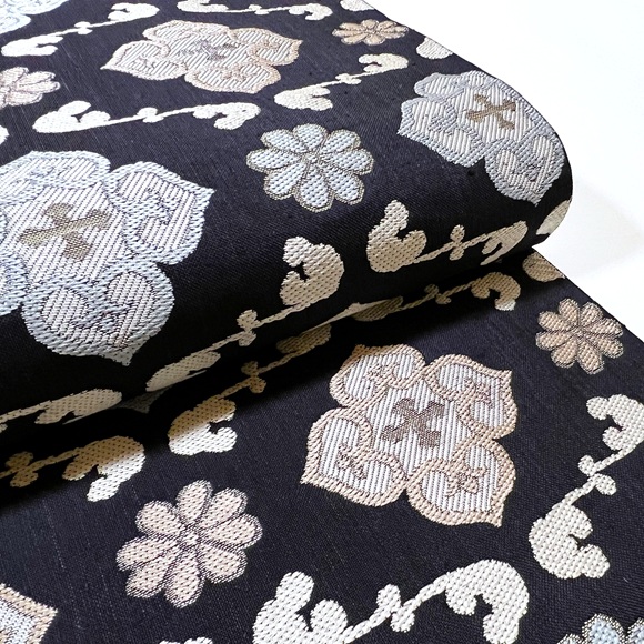 約300年前に中央アジアからトルコ・中国などを経由して伝承された「鍋島緞通」の柄をモチーフに、洛風林独自の配色とデザインで仕上げられた名古屋帯「花十字文」